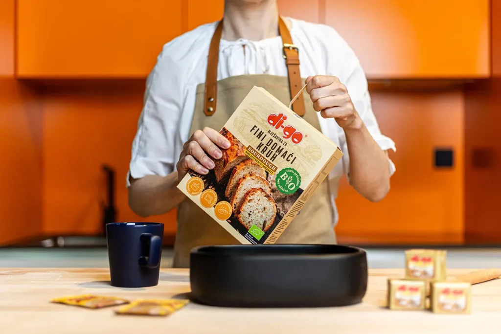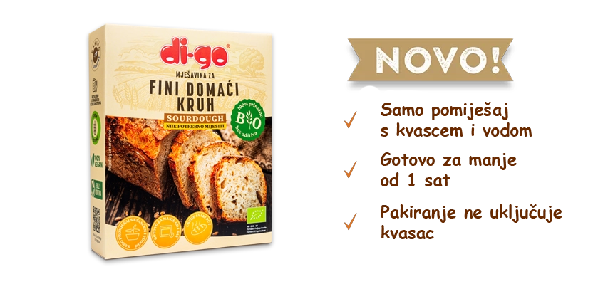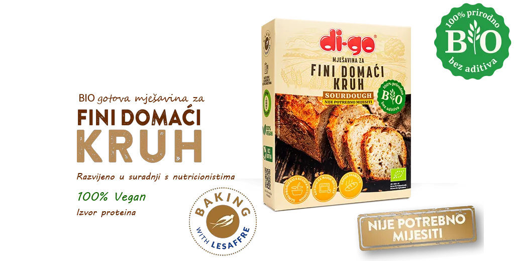 Put 400 g BIO Fine Homemade Bread Mix and 7 g di-go dry yeast or 21 g (half a cube of di-go fresh yeast previously dissolved in lukewarm water) in a bowl and mix