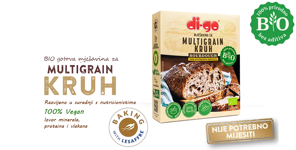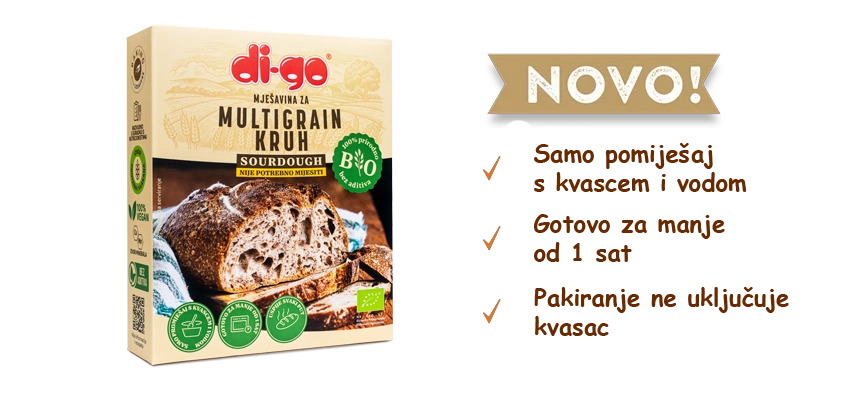Put 400 g BIO Multigrain Bread Mix and 7 g di-go dry yeast or 21 g (half a cube of di-go fresh yeast previously dissolved in lukewarm water) in a bowl and mix.