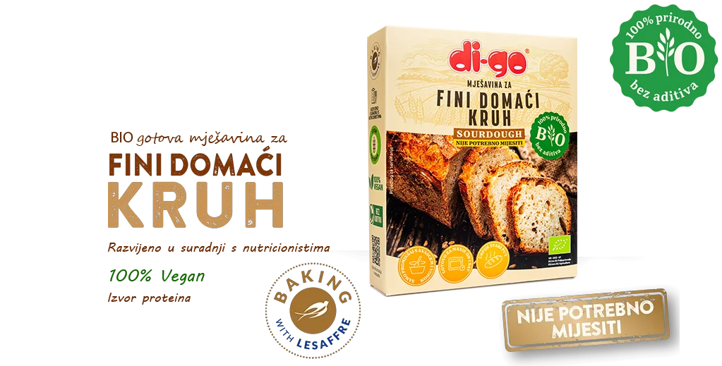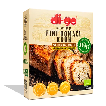 U posudu staviti 400 g BIO Mješavine za Fini domaći kruh i 7 g di-go suhog kvasca ili 21 g (pola kockice di-go svježeg kvasca unaprijed otopljenog u mlakoj vodi) te promiješati